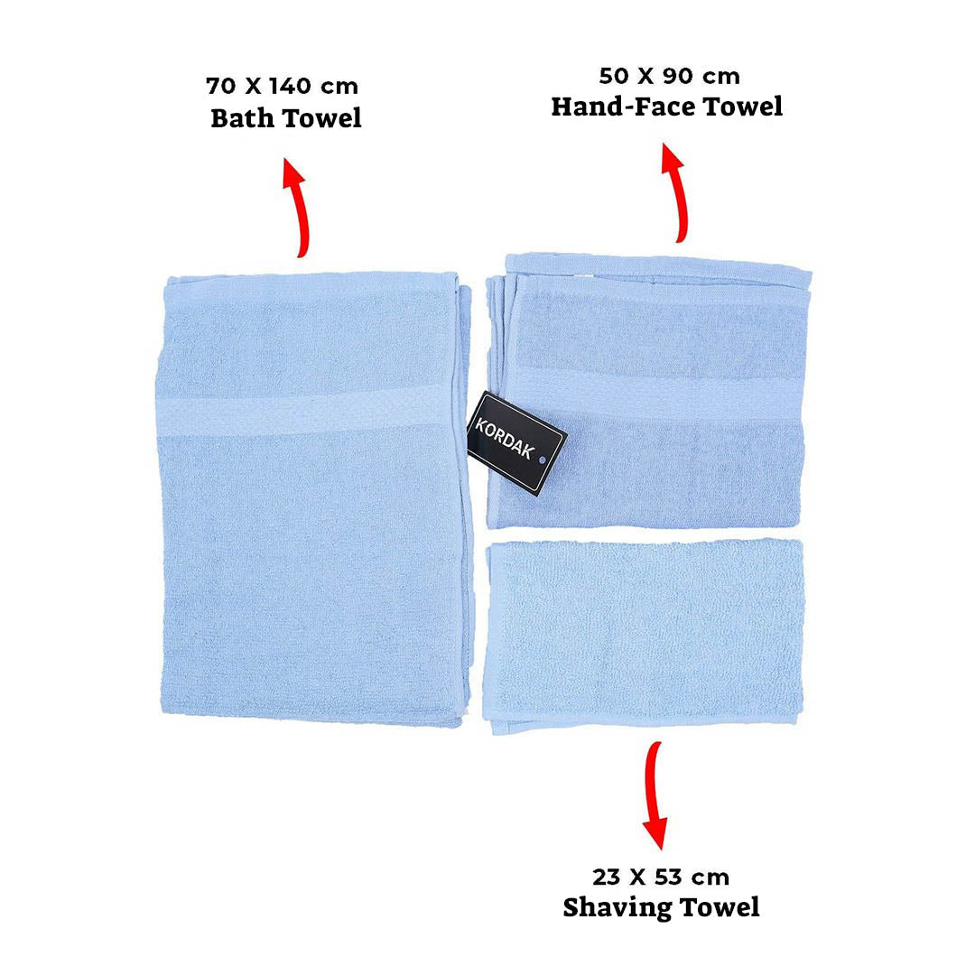 The bath and hand-face towel is blue, the shaving towel is light blue.